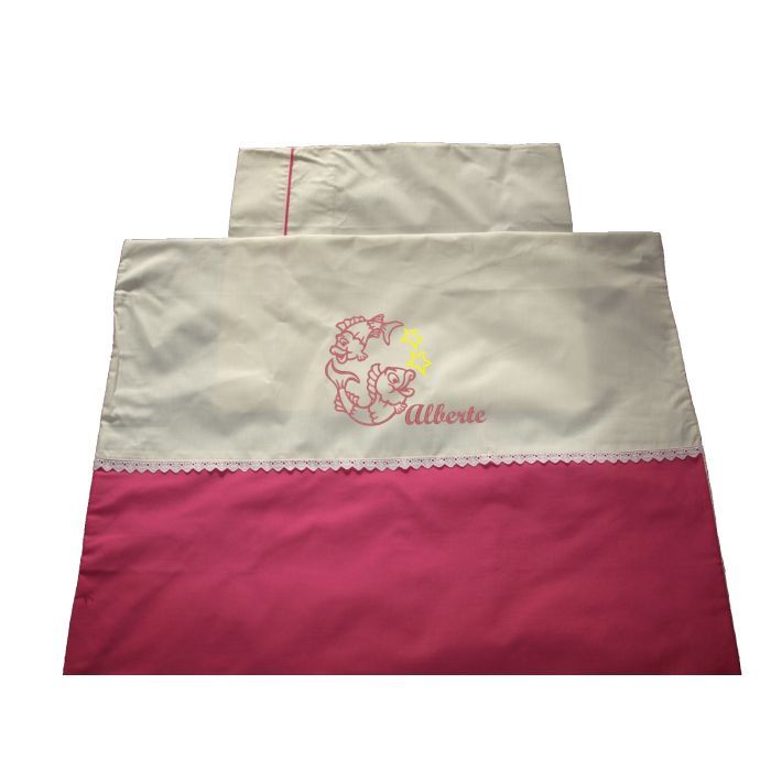 Pink junior sengetøj med barnets stjernetegn og navn. Stjernetegn, navn (og evt. fødselsdato) broderes i pink, så det matcher det bestilte sæt.