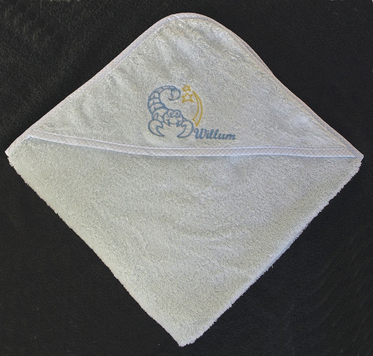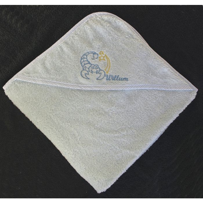 På badeslagets hætte broderes babys stjernetegn og fornavn i lyseblåt.